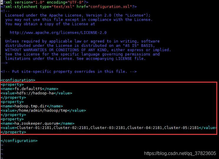 <configuration><property><name>fs.defaultFS</name><value>hdfs://hadoop-ha</value></property><property><name>hadoop.tmp.dir</name><value>/home/admin/hadoop/tmp</value></property><property><name>ha.zookeeper.quorum</name><value>Cluster-01:2181,Cluster-02:2181,Cluster-03:2181,Cluster-04:2181,Cluster-05:2181</value></property></configuration>![]()