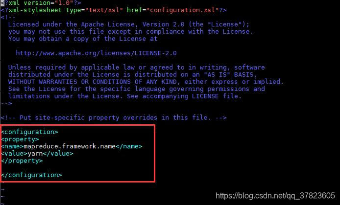 <configuration><property><name>mapreduce.framework.name</name><value>yarn</value></property></configuration>
