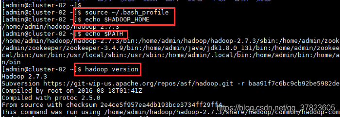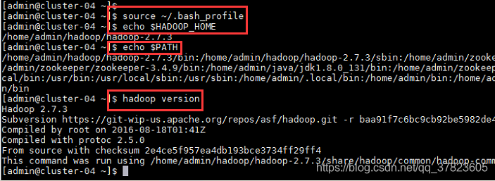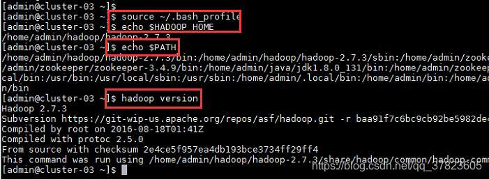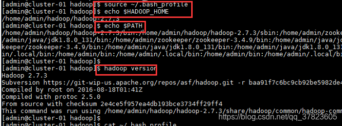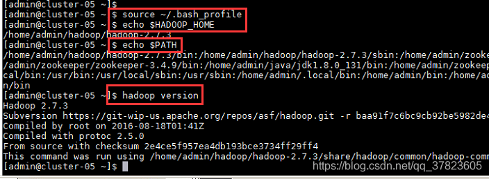 2、使新配置的环境变量立即生效,查看新添加和修改的环境变量是否设置成功,以及环境变量是否正确,验证Hadoop的安装配置是否成功;