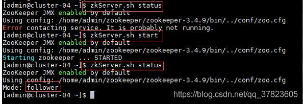 1、查看Zookeeper服务状态,若集群中只有一个"leader"节点, 其余的均为"follower"节点,则集群的工作状态正常 $zkServer.sh status 2、在集群中所有主机上使用此命令,启动Zookeeper服务 $zkServer.sh start…
