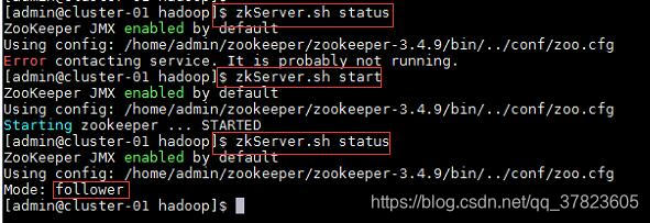 如果Zookeeper未启动,则在集群中所有主机使用“zkServer.sh start”命令,启动Zookeeper服务的脚本;