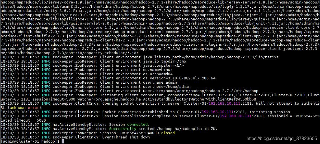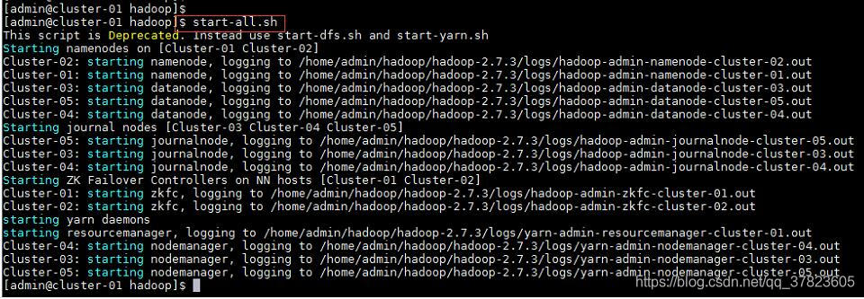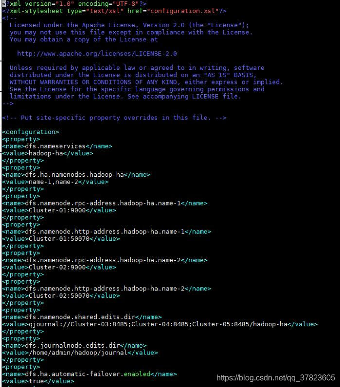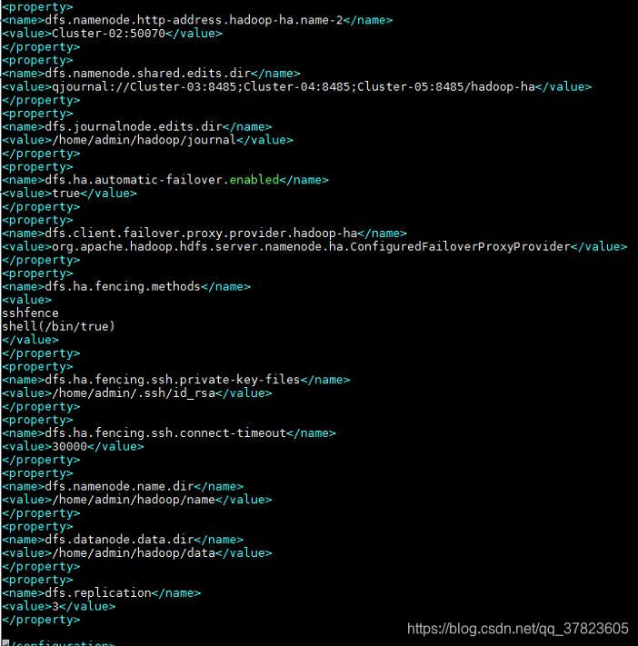 <configuration><property><name>dfs.nameservices</name><value>hadoop-ha</value></property><property><name>dfs.ha.namenodes.hadoop-ha</name><value>name-1,name-2</value></property><property><name>dfs.namenode.rpc-address.hadoop-ha.name-1</name><value>Cluster-01:9000</value></property><property><name>dfs.namenode.http-address.hadoop-ha.name-1</name><value>Cluster-01:50070</value></property><property><name>dfs.namenode.rpc-address.hadoop-ha.name-2</name><value>Cluster-02:9000</value></property><property><name>dfs.namenode.http-address.hadoop-ha.name-2</name><value>Cluster-02:50070</value></property><property><name>dfs.namenode.shared.edits.dir</name><value>qjournal://Cluster-03:8485;Cluster-04:8485;Cluster-05:8485/hadoop-ha</value></property><property><name>dfs.journalnode.edits.dir</name><value>/home/admin/hadoop/journal</value></property><property><name>dfs.ha.automatic-failover.enabled</name><value>true</value></property><property><name>dfs.client.failover.proxy.provider.hadoop-ha</name><value>org.apache.hadoop.hdfs.server.namenode.ha.ConfiguredFailoverProxyProvider</value></property><property><name>dfs.ha.fencing.methods</name><value>sshfenceshell(/bin/true)</value></property><property><name>dfs.ha.fencing.ssh.private-key-files</name><value>/home/admin/.ssh/id_rsa</value></property><property><name>dfs.ha.fencing.ssh.connect-timeout</name><value>30000</value></property><property><name>dfs.namenode.name.dir</name><value>/home/admin/hadoop/name</value></property><property><name>dfs.datanode.data.dir</name><value>/home/admin/hadoop/data</value></property><property><name>dfs.replication</name><value>3</value></property></configuration>![]()