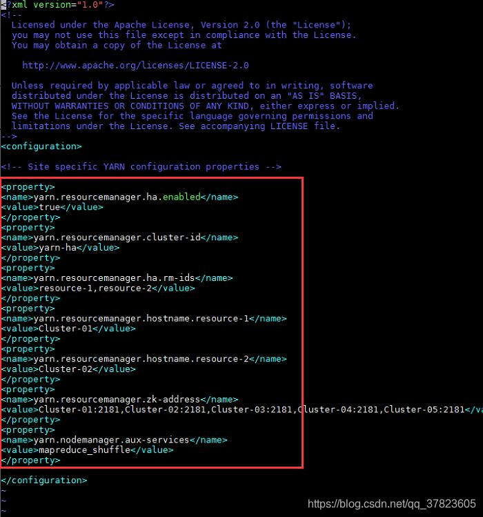 <configuration><!-- Site specific YARN congfiguration proerties --><property><name>yarn.resourcemanager.ha.enabled</name><value>true</value></property><property><name>yarn.resourcemanager.cluster-id</name><value>yarn-ha</value></property><property><name>yarn.resourcemanager.ha.rm-ids</name><value>resource-1,resource-2</value></property><property><name>yarn.resourcemanager.hostname.resource-1</name><value>Cluster-01</value></property><property><name>yarn.resourcemanager.hostname.resource-2</name><value>Cluster-02</value></property><property><name>yarn.resourcemanager.zk-address</name><value>Cluster-01:2181,Cluster-02:2181,Cluster-03:2181,Cluster-04:2181,Cluster-05:2181</value></property><property><name>yarn.nodemanager.aux-services</name><value>mapreduce_shuffle</value></property></configuration>