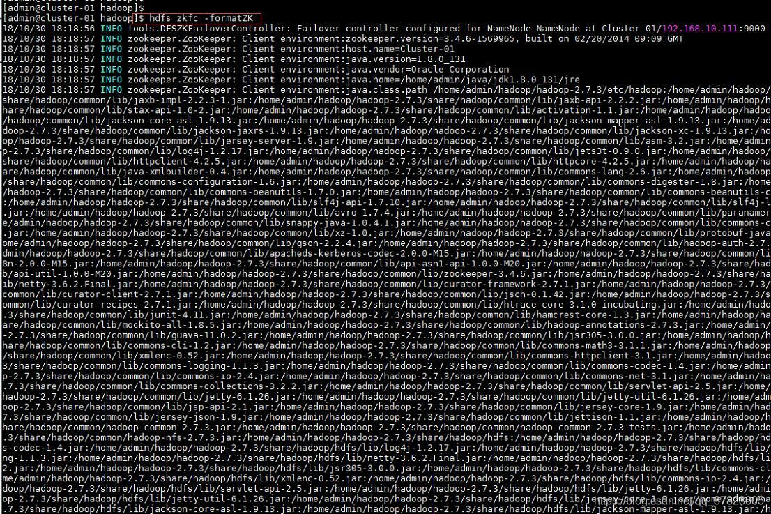 5、在主节点使用“hdfs zkfc -formatZK”命令,对Hadoop集群在Zookeeper中的主节点切换控制信息进行格式化。
