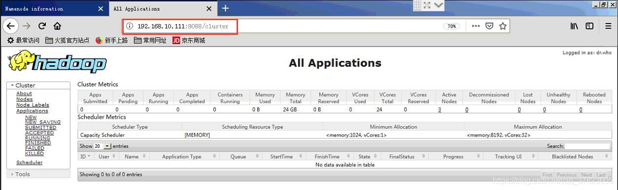 1、使用浏览器访问192.168.10.111:8088,查看并管理Hadoop
