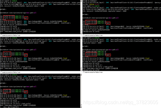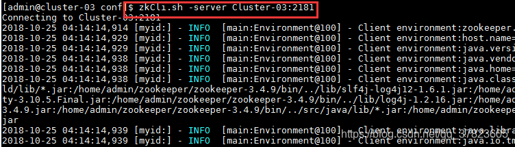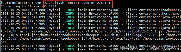 5、在集群中所有主机上使用命令“zKCli.sh -server Cluster-*:2181”利用Zookeeper的命令行工具链接Zookeeper集群,其中“*”为节点的编号,可以选择连接集群中的任意一个节点,若显示“CONNECTED”则表示链接正常,命令行工具可以正常使用;