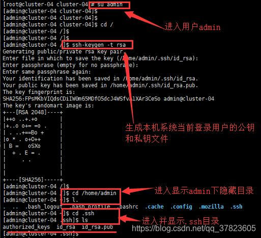 - 登录进admin用户后输入命令$ssh-keygen -t rsa ,后进入显示~目录下隐藏文件,无文件;