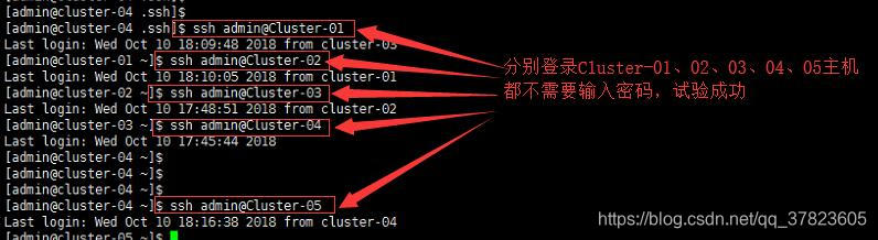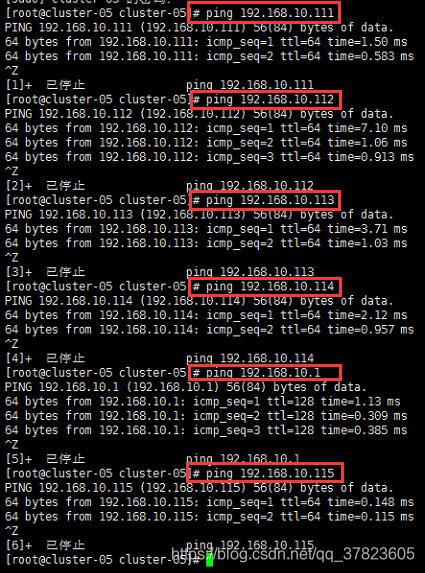 2、各主机间互拼验证(使用cluster-01分别拼其他四台主机的IP地址)