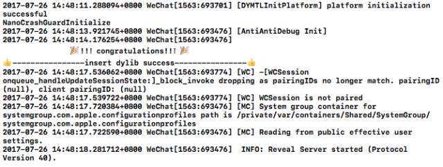 然后点击运行即可,运行后可以从控制台看到动态库已经注入成功,Reveal已经成功加载!当然手机上面也运行起来了!