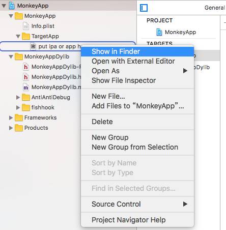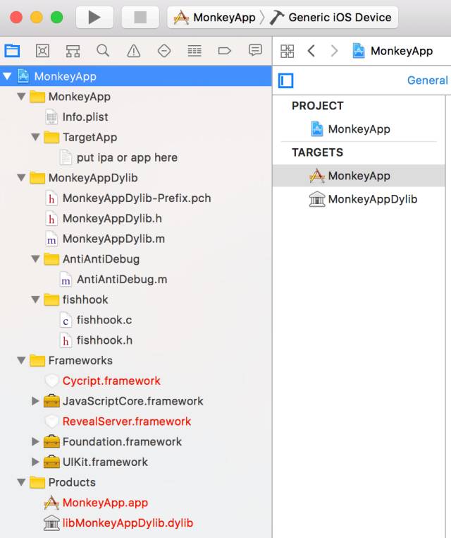 MonkeyAppDylib这个是将被注入目标App的动态库,你自己要hook的代码可以在MonkeyAppDylib.m文件里面写,我在里面写了一些Demo代码,直接运行即可看到效果,支持OC runtime的HOOK,C函数的fishhook。