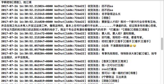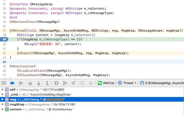 CHDeclareClass(CMessageMgr)CHMethod2(void, CMessageMgr, AsyncOnAddMsg, NSString*, msg, MsgWrap, CMessageWrap*, msgWrap){NSString* content = [msgWrap m_nsContent];if([msgWrap m_uiMessageType] == 1){NSLog(@"收到消息: %@", content);}CHSuper2(CMessageMgr, AsyncOnAddMsg, msg, MsgWrap, msgWrap);
