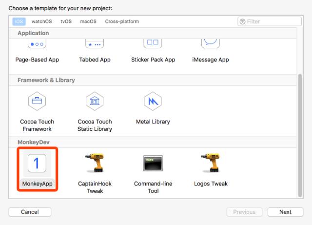 安装完成之后,打开Xcode,点击File - New - Project...,选择iOS滑动到最下方可以看到MonkeyDev提供的模块: