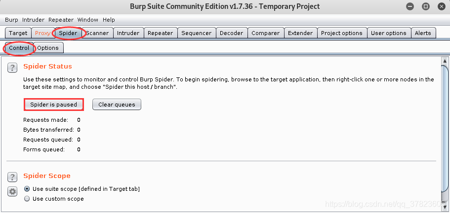 注:单击“Spider”选项卡中的“Control”标签,单击“Spider is running”按钮,下方显示已经请求数量,字节传输量,爬虫范围等信息;