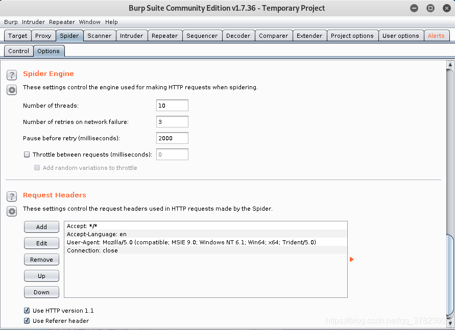 注:对“Spider”选项卡下的“Options”子选项卡的有关选项取默认配置;