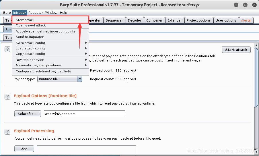 6.1.9、设置完成后,单击Brup Suite中的“Intruder”菜单项,选择“Start attack”命令;