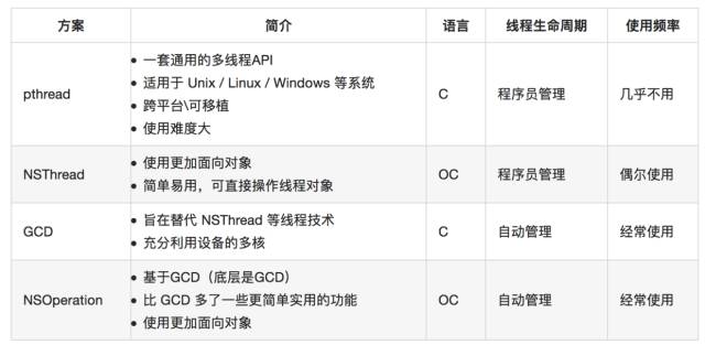 多线程的四种解决方案分别是:pthread,NSThread,GCD, NSOperation。