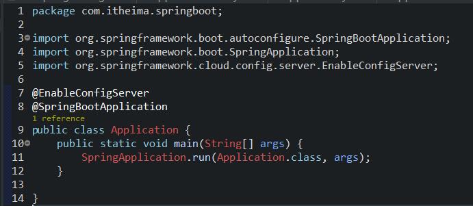 1.4、创建启动类,并在类上添加@EnableConfigServer注解以开启服务端功能;