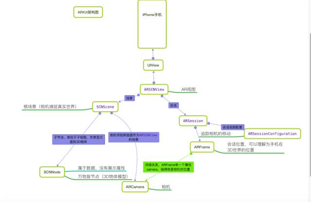 ARSCNView时将不再累述这一关系,可以简单的理解为:ARSCNView所有跟场景和虚拟物体相关的属性及方法都是自己父类SCNView的ARSession的作用及原理将在本篇下一小节介绍