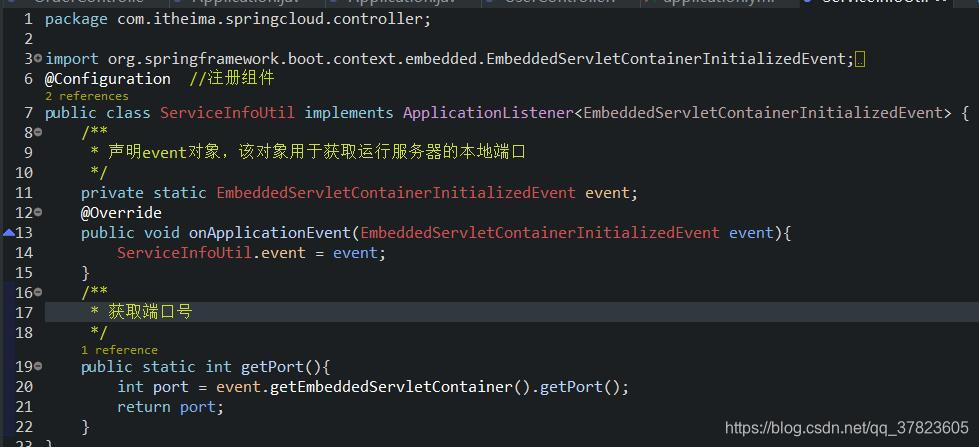 1.3、创建服务监听类,为了演示负载均衡的实现效果,在这里ms-spring-eureka-order工程中创建一个用于监听服务实例端口的工具类ServiceInfoUtil,实现代码如下: