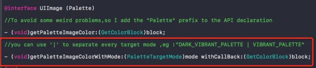 在iOS-Palette中,我采用了跟TTAVPlayer[了解更多,点击查看]一样的设计思想:“保证最小的接入成本同时保证最大的扩展性”。对于绝大部分需求,你不需要去了解PaletteTarget,什么高亮度低饱和这样的概念,你只需要调用这些简单的API: