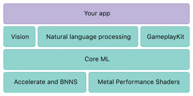 Core ML 是领域特定 (domain-specific) 框架和功能的基础所在。Core ML 为 Vision 提供了图像处理的支持,为 Foundation 提供了自然语言处理的支持(例如 NSLinguisticTagger 类),为 GameplayKit 提供了对学习决策树 (learned decision tree) 进行分析的支持。Core ML 本身是基于底层基本类型而建立的,包括 Accelerate、BNNS 以及 Metal Performance Shaders 等。