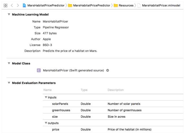 您可以通过在 Xcode 中打开这个模型,从而来查看它的相关信息,其中包括有模型类型以及其预期输入和输出。模型的输入为太阳能板和温室的数量,以及殖民地的规模大小(以英亩为单位)。模型的输出则是对这个殖民地价值的预测。