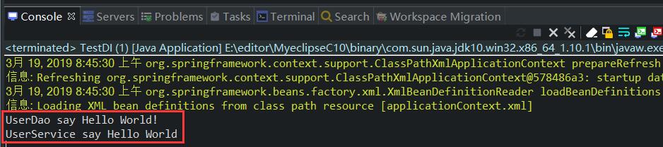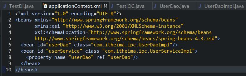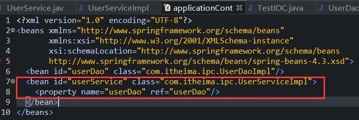 3.在配置文件applicationContext.xml中,创建一个id为userService的Bean,该Bean用于实例化UserServiceImpl类的信息,并将userDao的实例植入到userService中。