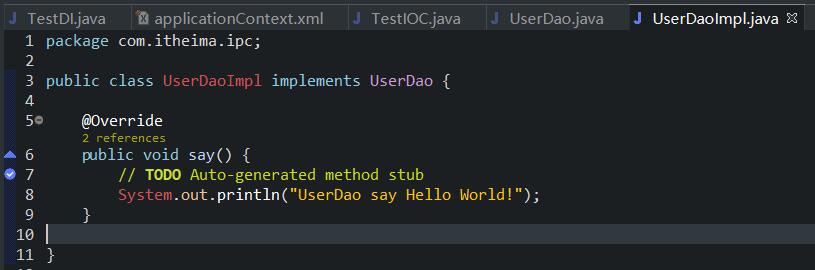3.在com.itheima.ioc包下,创建UserDao接口的实现类UserDaoImpl,该类需要实现接口中的say()方法,并在方法中编写一条输出语句。