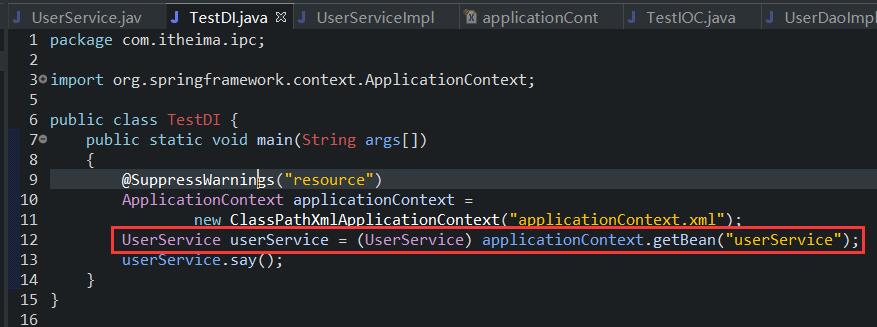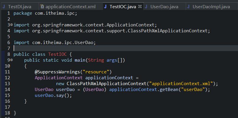 5.在com.itheima.ioc包下,创建测试类TestIOC,并在类中编写main()方法。在main()方法中,需要初始化Spring容器,并加载配置文件,然后通过Spring容器获取userDao实例(即java对象),最后调用实例中的say()方法。