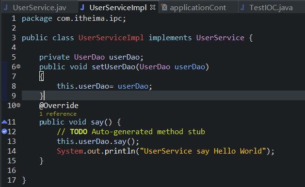 2.在com.itheima.ioc包中,创建UserService接口的实现类UserServiceImpl,在类中生命userDao属性,并添加属性的setter方法。