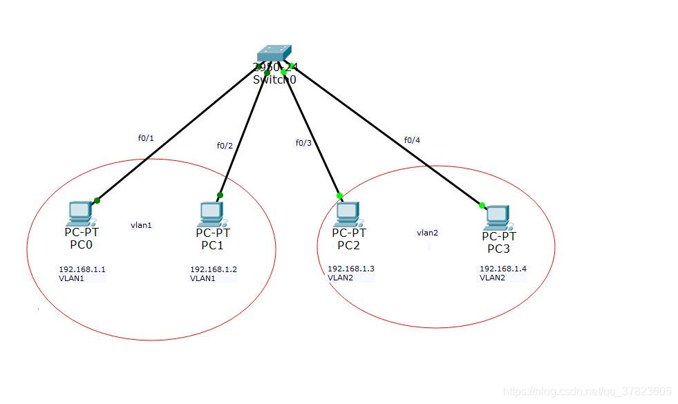 VLAN划分 1.配置环境 :创建4台PC机,并为PC机配置IP PC0:192.168.1.1/24 PC1:192.168.1.2/24 PC2:192.168.1.3/24 PC3:192.168.1.4/24 2.修改交换机名称: 创建VLAN1和VLAN2:…