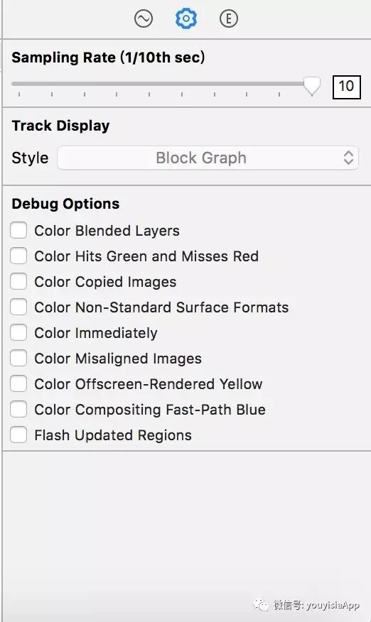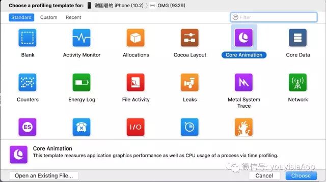 Instruments 是一系列工具集,我们这里只演示 Core Animation 的使用。在 Core Animation 选项右下方会看到如下选项,