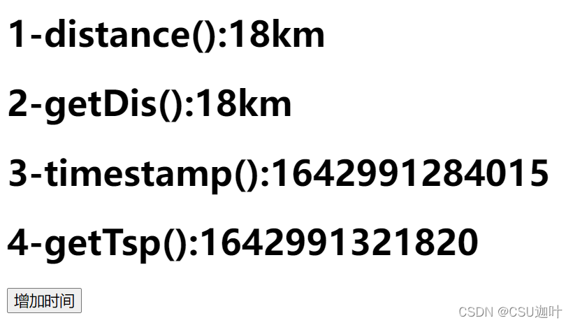 <script>const app = Vue.createApp({data(){return{time:0.5,speed:18,nobody:"干扰项",}},computed:{distance(){return this.time*this.speed;},timestamp(){return Date.now();}},methods:{getDis(){return this.time*this.speed;},getTsp(){return Date.now();},addTime(){this.time += 0.5},},template:`<h1>1-distance():{{distance}}km</h1><h1>2-getDis():{{getDis()}}km</h1><h1>3-timestamp():{{timestamp}}</h1><h1>4-getTsp():{{getTsp()}}</h1><button @click="addTime">增加时间</button> `})const vm = app.mount('#app')