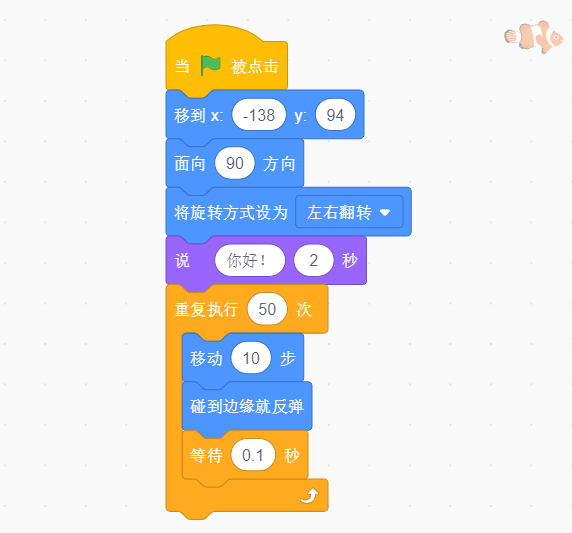 - 初始位置:X=-138,Y=94。(Fish初始位置为舞台上方的左侧,面向右)