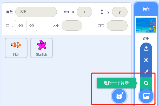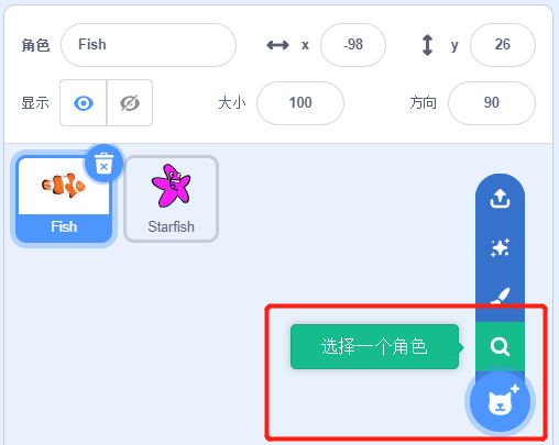 删除默认的小猫角色,然后从角色库中选择 Fish、Starfish 添加进来,如下图所示: