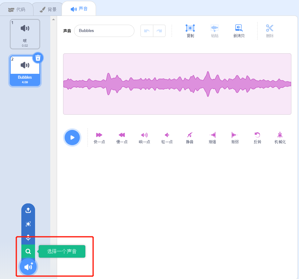 - 播放指定的声音,声音开始播放的同时立刻执行后面的积木指令。
