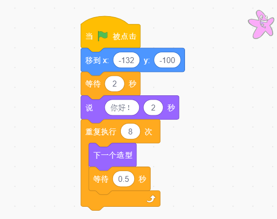 - 重复执行8次:(Starfish不动,每过0.5秒切换一次造型)