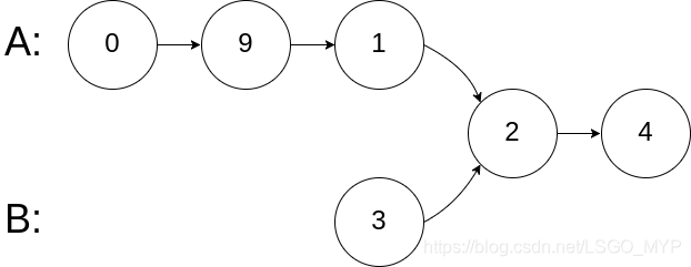 从各自的表头开始算起,链表 A 为 [0,9,1,2,4],链表 B 为 [3,2,4]。