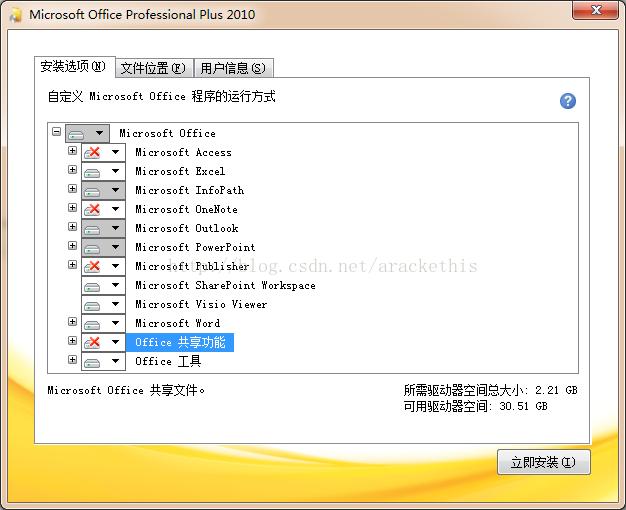 什么原因?这个安装包我以前在其它电脑上装过,确定可用。想了一下,上次我禁用了一些office里我不需要的功能,其中包括Microsoft Access下面的“Access Business Connectivity Service” 和 Office 共享功能下面的“Business Connectivity Service”等,如下: