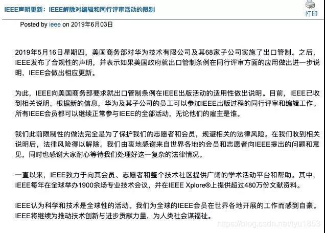 6 月 3 日,IEEE 中文站发布最新中英文双语声明,解除对华为员工参与编辑和审稿的限制。 IEEE 在声明中称,「目前 IEEE已收到相关说明。根据新的信息,华为及其子公司的员工可以参加 IEEE 出版过程的同行评审和编辑工作」。 IEEE 还强…