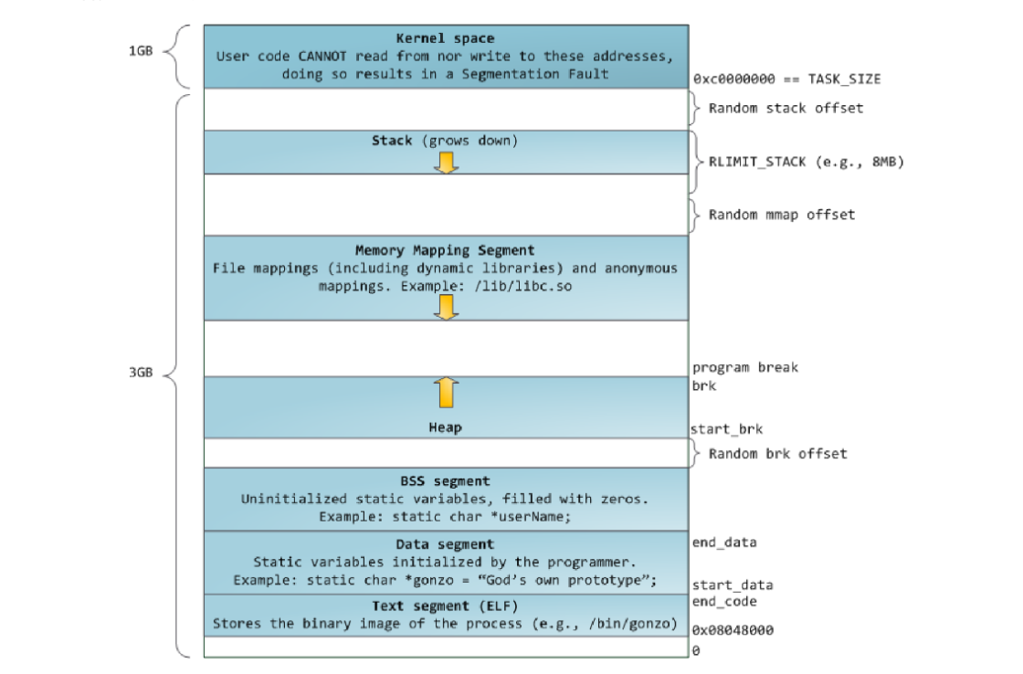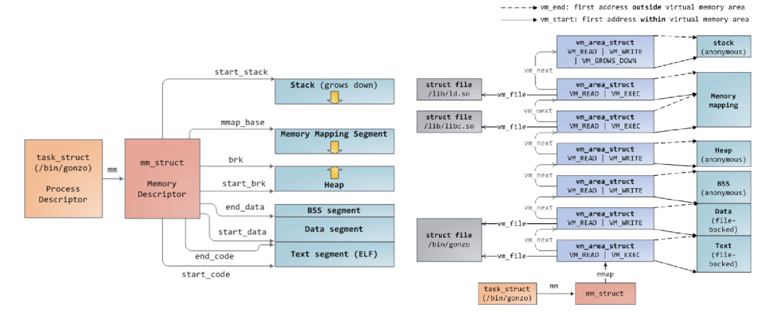 - malloc() 会调用 brk() 或 mmap() 来向kernel注册合法的虚拟内存地址空间 Virtual Memory Area (VM Area),详细键 5.0开头。