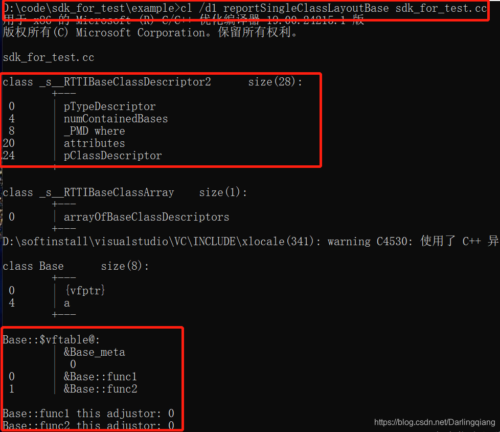 使用命令:cl /d1 reportSingleClassLayoutXXX [filename],XXX表示类名,[filename]表示类所在的.cpp文件路径 如下所示