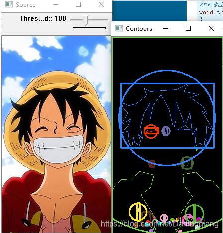 /// 画多边形轮廓 + 包围的矩形框 + 圆形框Mat drawing = Mat::zeros(threshold_output.size(), CV_8UC3);for (int i = 0; i< contours.size(); i++){Scalar color = Scalar(rng.uniform(0, 255), rng.uniform(0, 255), rng.uniform(0, 255));drawContours(drawing, contours_poly, i, color, 1, 8, vector<Vec4i>(), 0, Point());rectangle(drawing, boundRect[i].tl(), boundRect[i].br(), color, 2, 8, 0);circle(drawing, center[i], (int)radius[i], color, 2, 8, 0);}