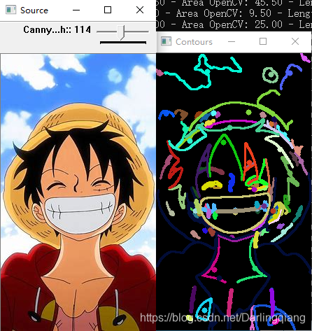 {/// 读入原图像, 返回3通道图像数据src = imread("C:\\Users\\guoqi\\Desktop\\ch7\\15.jpg", 1);/// 把原图像转化成灰度图像并进行平滑cvtColor(src, src_gray, CV_BGR2GRAY);blur(src_gray, src_gray, Size(3, 3));/// 创建新窗口char* source_window = "Source";namedWindow(source_window, CV_WINDOW_AUTOSIZE);imshow(source_window, src);createTrackbar(" Canny thresh:", "Source", &thresh, max_thresh, thresh_callback);thresh_callback(0, 0);waitKey(0);return(0);