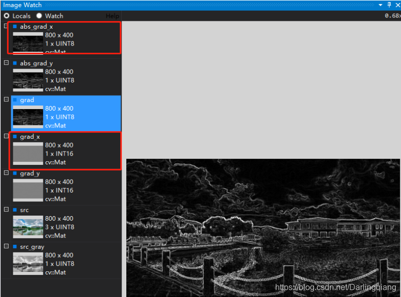 /// 创建 grad_x 和 grad_y 矩阵Mat grad_x, grad_y;Mat abs_grad_x, abs_grad_y;/// 求 X方向梯度//Scharr( src_gray, grad_x, ddepth, 1, 0, scale, delta, BORDER_DEFAULT );Sobel(src_gray, grad_x, ddepth, 1, 0, 3, scale, delta, BORDER_DEFAULT);convertScaleAbs(grad_x, abs_grad_x);//将中间结果转换到 CV_8U:/// 求Y方向梯度//Scharr( src_gray, grad_y, ddepth, 0, 1, scale, delta, BORDER_DEFAULT );Sobel(src_gray, grad_y, ddepth, 0, 1, 3, scale, delta, BORDER_DEFAULT);convertScaleAbs(grad_y, abs_grad_y);