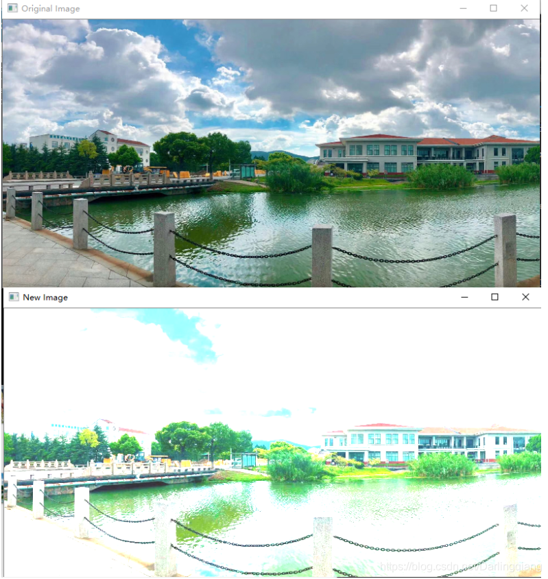 /// 显示图像imshow("Original Image", image);imshow("New Image", new_image);cv::imwrite("C://Users//guoqi//Desktop//ch7//4.jpg", image);/// 等待用户按键waitKey();return 0;
