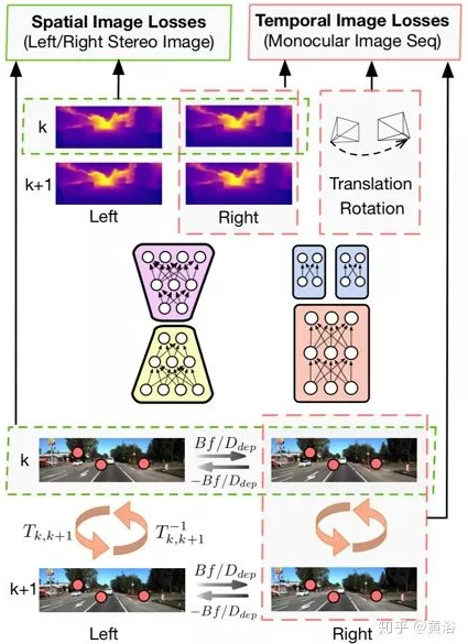 如图所示,用立体图像序列的时空几何一致性来定义损失函数。空间几何一致性表示左右图像对中的对应点之间的外极线约束,而时间几何一致性表示两个连续单目图像中的对应点之间的几何投影约束。这些约束构造最后的损失函数并使其最小化,而UnDeepVO学习端对端无监督方式估计尺度化的6-DoF姿势和深度图。简单提一下,空间损失函数包括光度一致性损失(Photometric Consistency Loss)、视差一致性损失(Disparity Consistency Loss)和姿态一致性损失(Pose Consistency Loss);时间损失函数包括光度一致性损失和3-D几何校准损失(3D Geometric Registration Loss)。