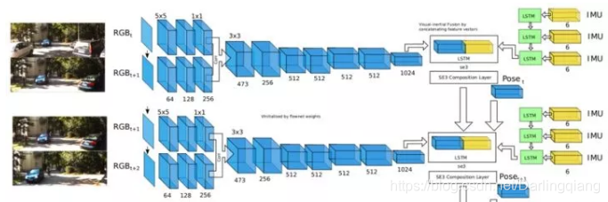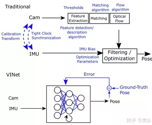 如图是比较传统VIO(visual-inertial odometry)和基于深度学习的VINet方法。VINet时一种使用视觉和惯性传感器进行运动估计的流形(on-manifold)序列到序列的学习方法。其优点在于:消除相机和IMU之间繁琐的手动同步,无需手动校准;模型自然地结合特定领域信息,显著地减轻漂移。