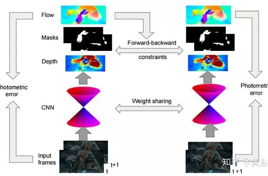 下图是SfM-Net的流程图。给定一对图像帧作为输入,模型将帧到帧像素运动分解为3D场景深度、3D摄像机旋转和平移、一组运动掩码和相应的3D刚性旋转和平移运动。然后,将得到的3D场景流反投影到2D光流中并相应地变形完成从这帧到下一帧的匹配像素。其中前向一致性检查会约束估计的深度值。