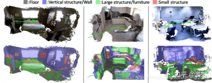 下面是一些结果:办公室场景(左)和NYU Depth V2数据集的两个厨房场景(中,右),第一行是重建,第二行是语义标签。